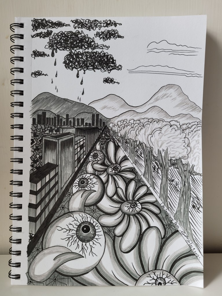 這些字眼裡,都有很多對比的,所以我把作品明顯地分成兩邊,左邊比較壓迫感,而右邊則相對平靜平和。中間是一條無盡頭的道路,以眼球和舌頭造成的,創造那種不穩定的感覺,而且會帶點恐怖、不安的。雖然這畫作是超現實作品,但這種感覺卻又非常現實。