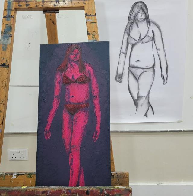 繪畫課的期終作品前奏,是以炭枝自畫裸體像,我並沒有那份勇氣去畫自己的裸體,於是我在網上搜尋裸體照,我找到了阿儀在參選時的泳裝照片,我把她畫下來了。