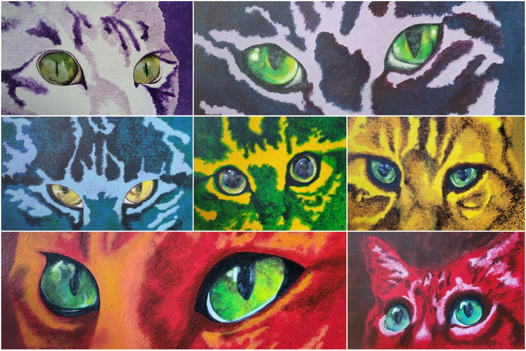 <<Eyes of My 7 Cats>> 7 pieces in a set. Acrylic on A3 size paper.