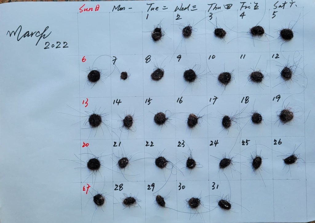 Hair loss isn’t must be a kind of sickness. One person loses 50-60 hair daily usually. It is part of my body. It dies and leaves me every day. At the same time, new hair grows in a continuous cycle. I start to collect my own hair loss. Make the record of the death and the birth of certain parts of my body.