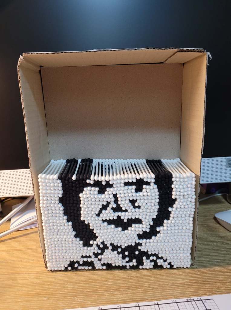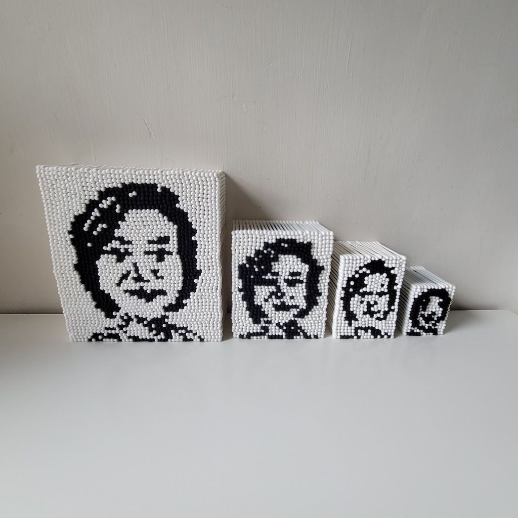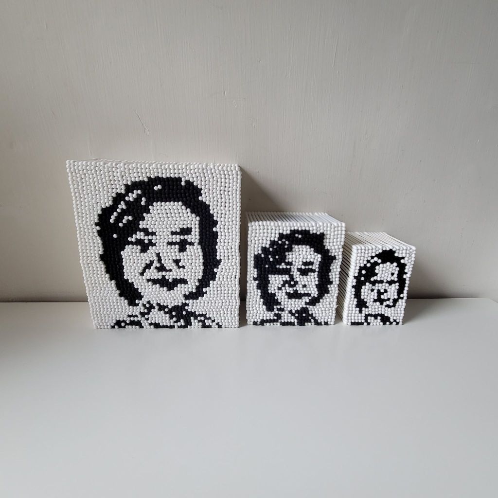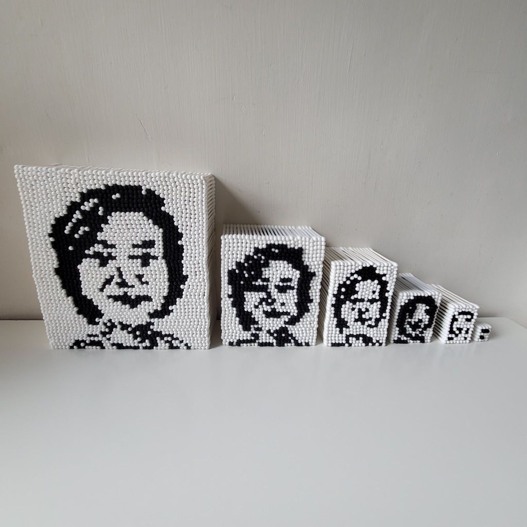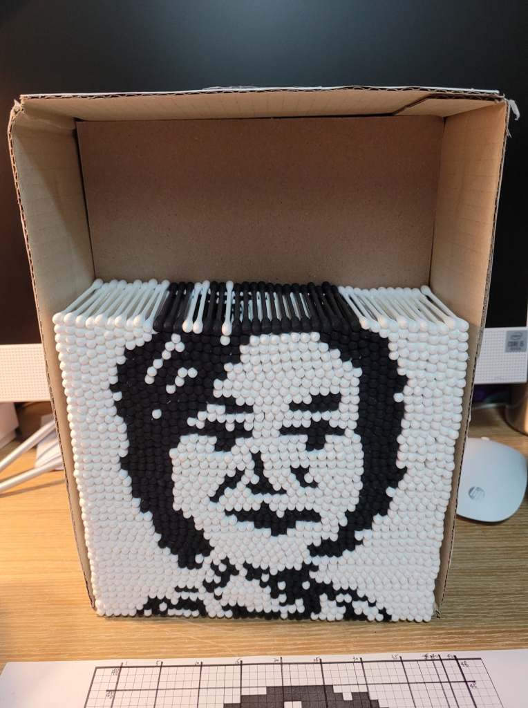 NFT Pixel Art 是NFT Art 中最流行的一種,以起格的頭像,模擬80年代的低清視覺藝術。以棉花棒一點點的特質,把虛擬的NFT Art組合成一件實體作品,再把作品拍照,上傳到NFT藝術平台出售。從虛擬到實體,再由實體到虛擬,我是實體還是虛擬的?