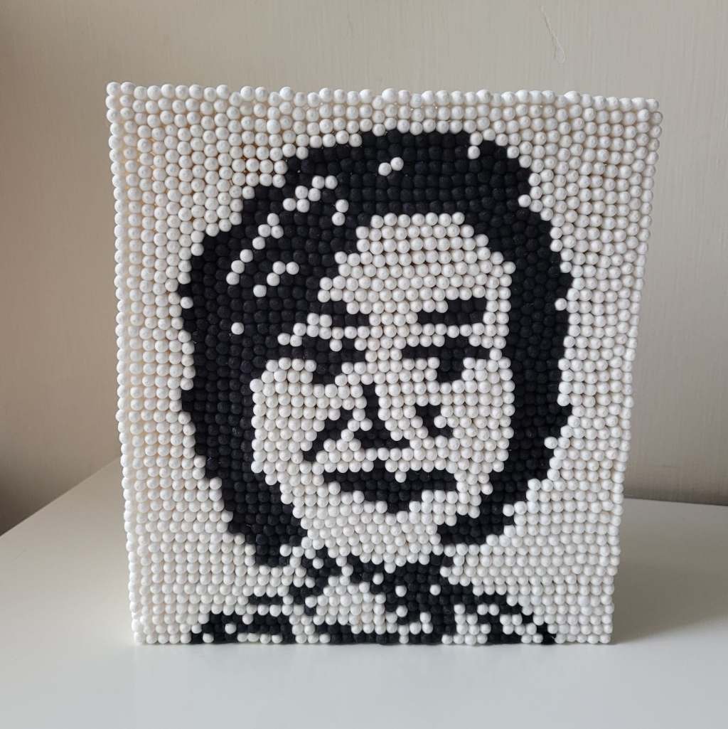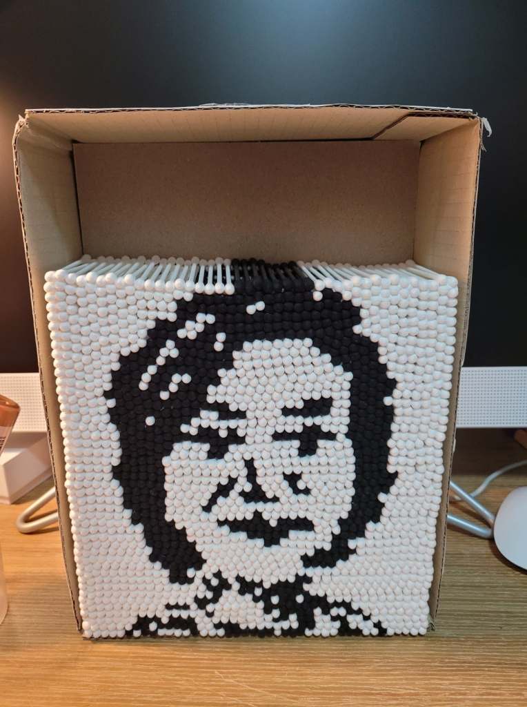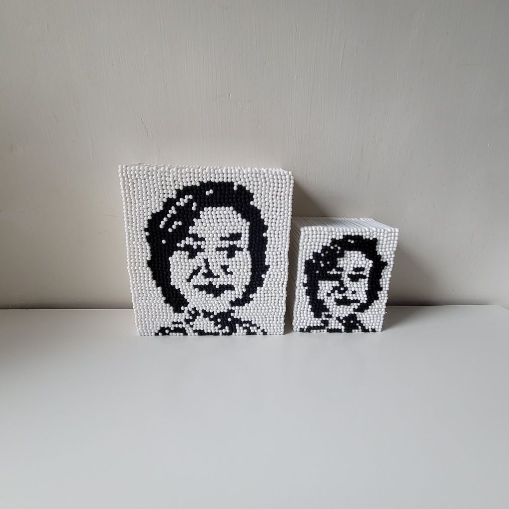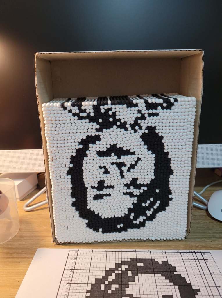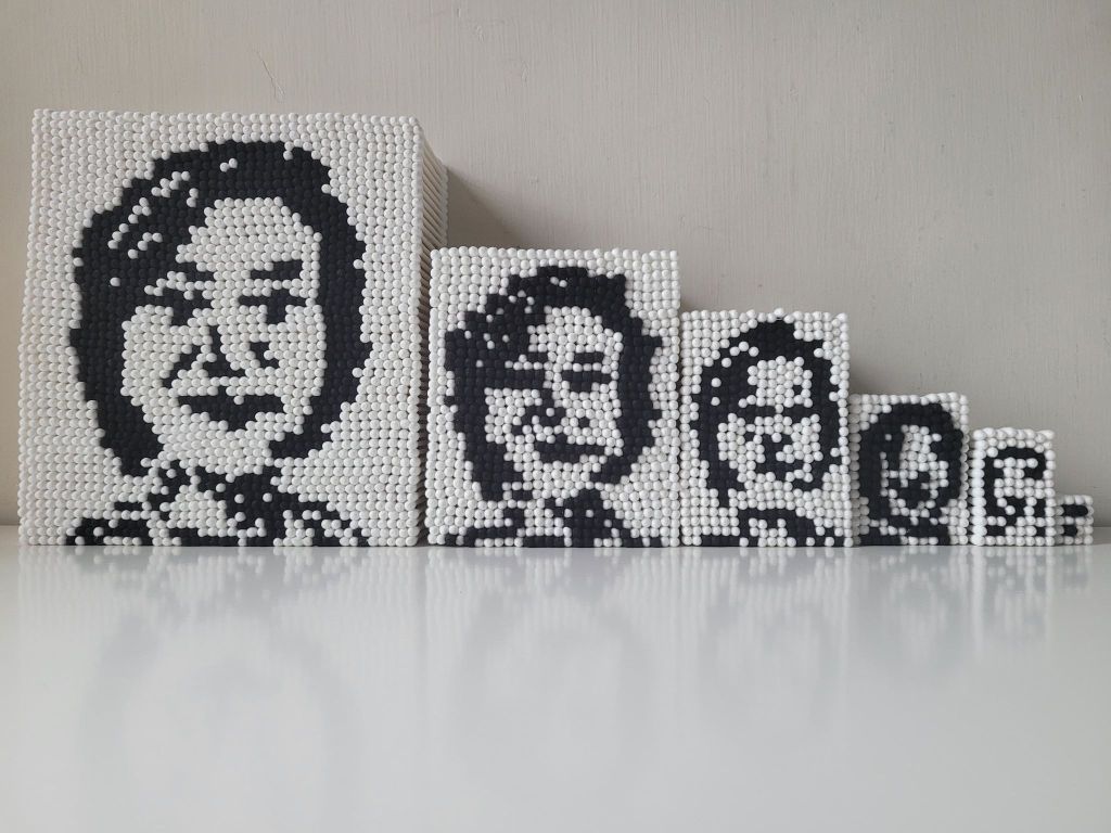 NFT Pixel Art 是NFT Art 中最流行的一種,以起格的頭像,模擬80年代的低清視覺藝術。以棉花棒一點點的特質,把虛擬的NFT Art組合成一件實體作品,再把作品拍照,上傳到NFT藝術平台出售。從虛擬到實體,再由實體到虛擬,我是實體還是虛擬的?