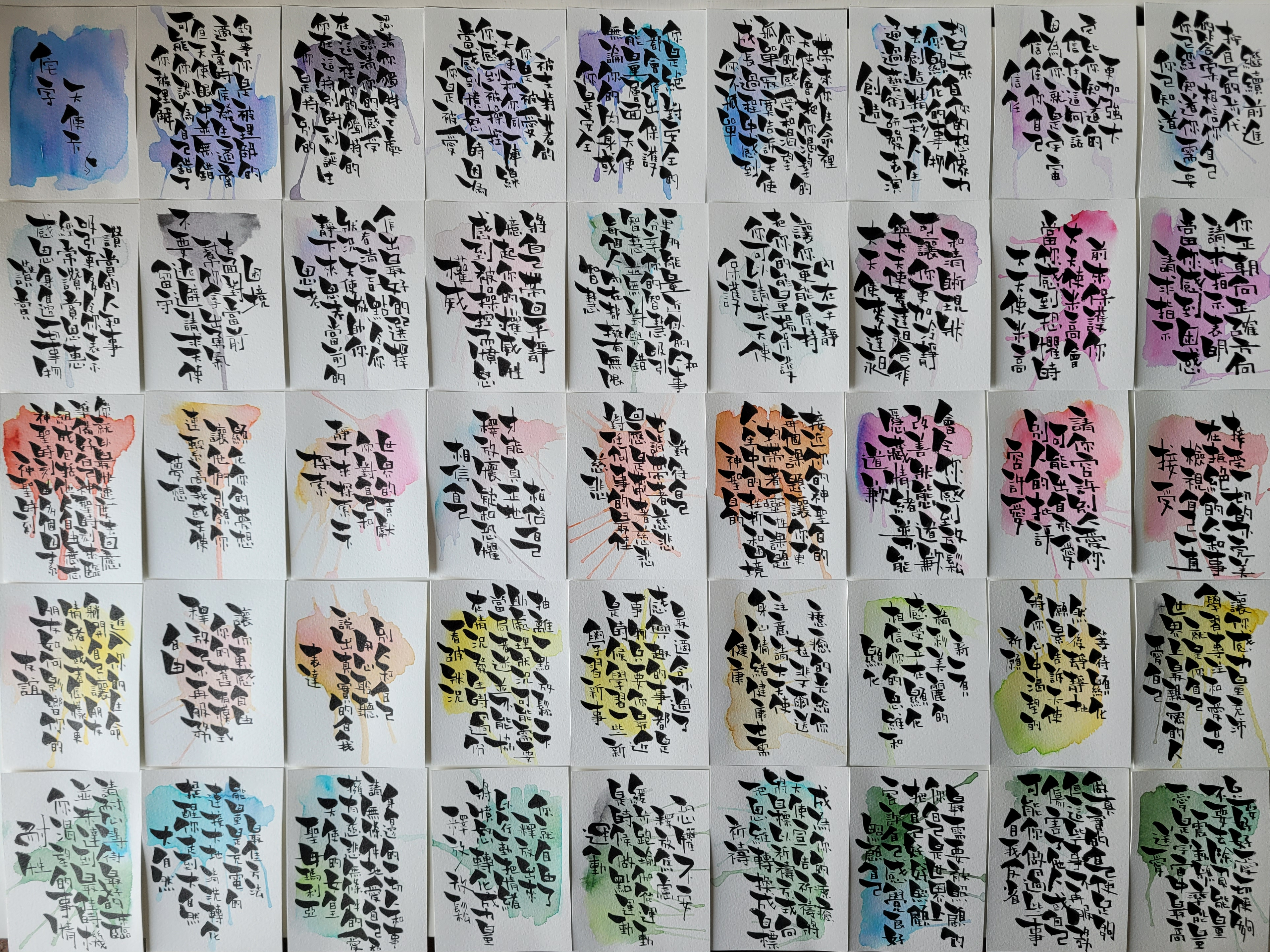 【佗字天使卡】原創字體「佗字」,取自「佗寂」(Wabi-Sabi) 的佗 (Wabi),喻意簡僕、寧靜、自我反醒等意境。天使卡是人們與天使溝通的方式,完全無需任何天賦能力,就能接收天使的正面訊息,在迷惘、疲憊的生活中,獲取鼓勵的最佳選擇。以手寫「佗字」的方式,寫上44張天使訊息,配以溫和的水彩顏色,平淡中帶有一點點活力!