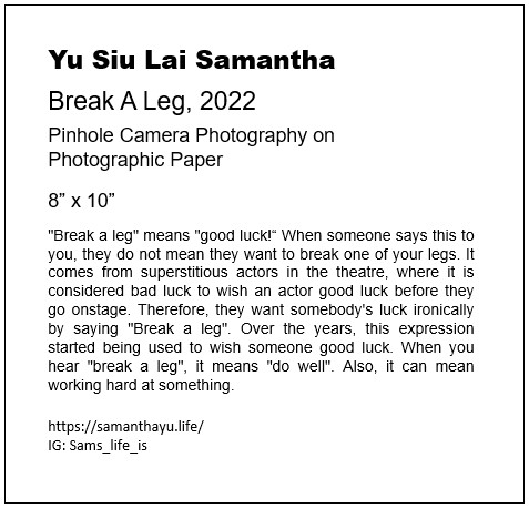 Education:Graduated from Hong Kong Art School’s Higher Diploma in Fine Art in 2023, majoring in Photography. Completed PhotoTherapy Certification and Mindfulness Facilitator Certification in the same year.