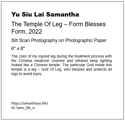 我受傷的腿,在治療期間,敷著中藥和被紅外線燈照著,他的顏色令我想起中式的寺廟。而這間寺廟內的神,就是一條腿 – 足神,他祝福和保護所有的腿,免於受傷。
