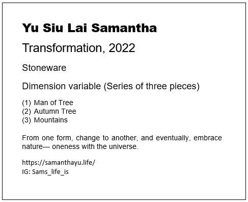 Exhibitions:2022 & 2023 | Hong Kong Art School Advanced Diploma in Fine Art Graduate Exhibition (Hong Kong) ;2023 | The Collectible Art Fair (Hong Kong) ;2024 | Collect Hong Kong (Hong Kong) .