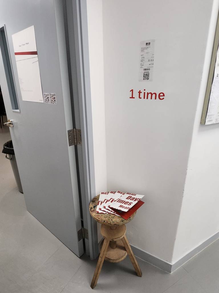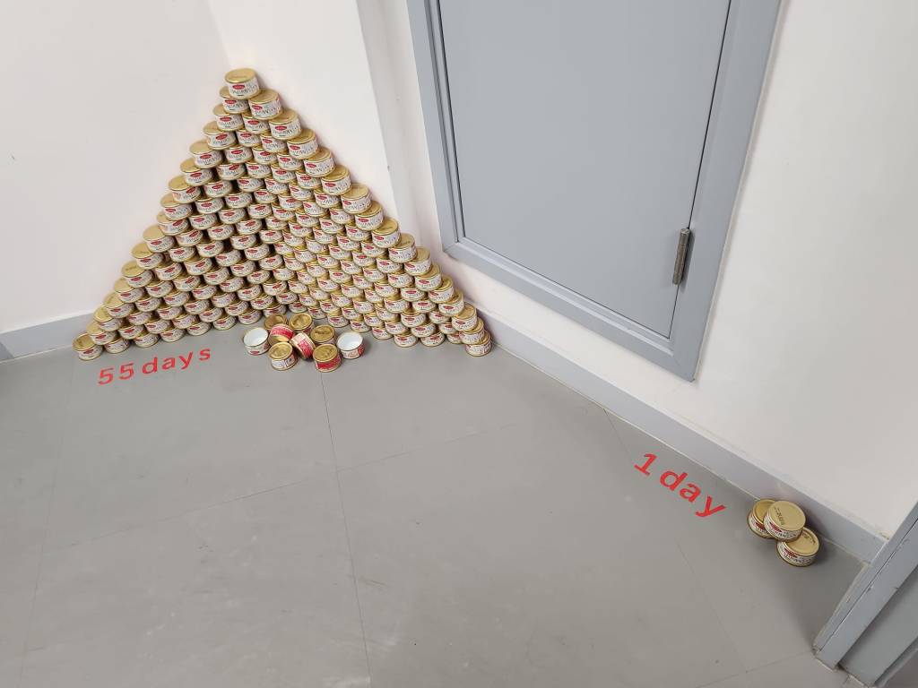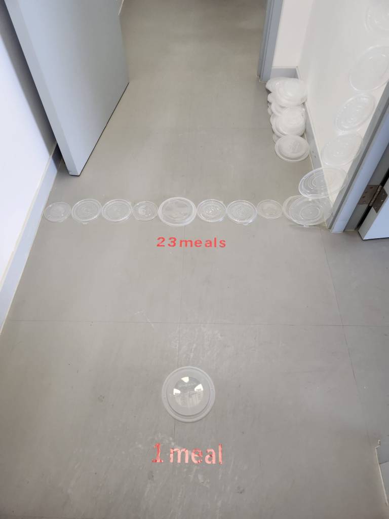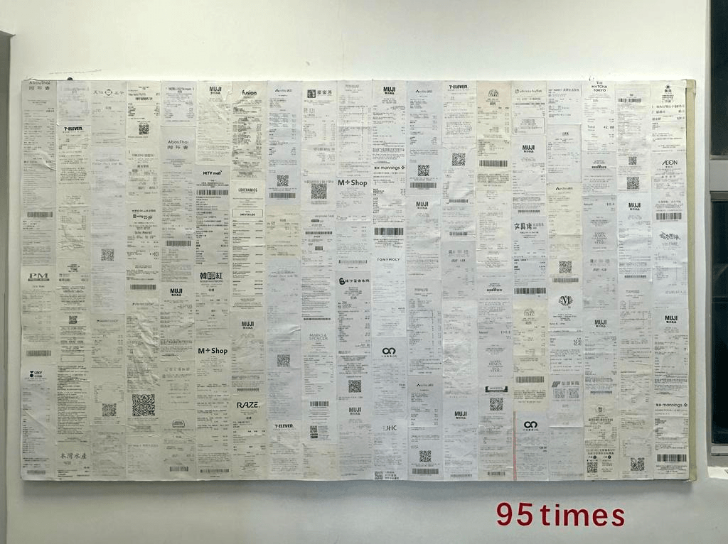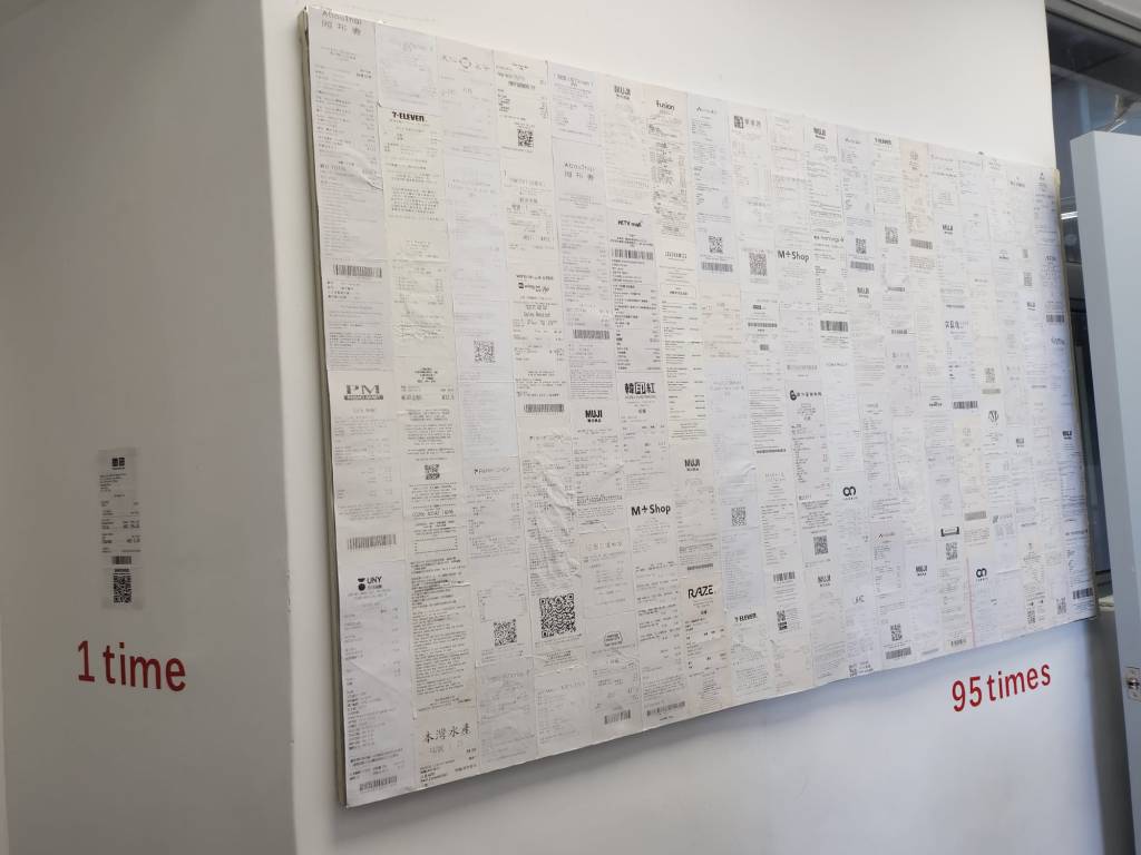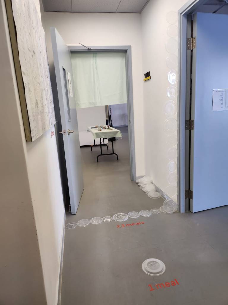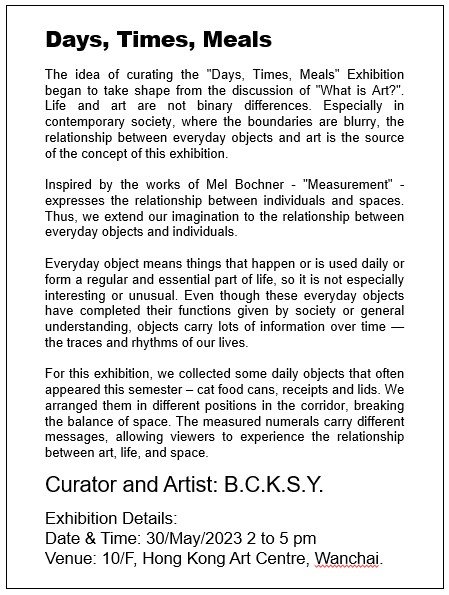 是次展覽我們以本學段時間作基礎,收集部份組員這段時間內經常出現的日常物 – 貓罐頭、消費單據和外賣膠蓋,將其簡約地排列於走廊不同的位置,打破空間的平衡。作品與觀者在此空間相遇,量度的數字承載了不同生活的痕跡,讓觀者體驗藝術、生活與空間的關係。