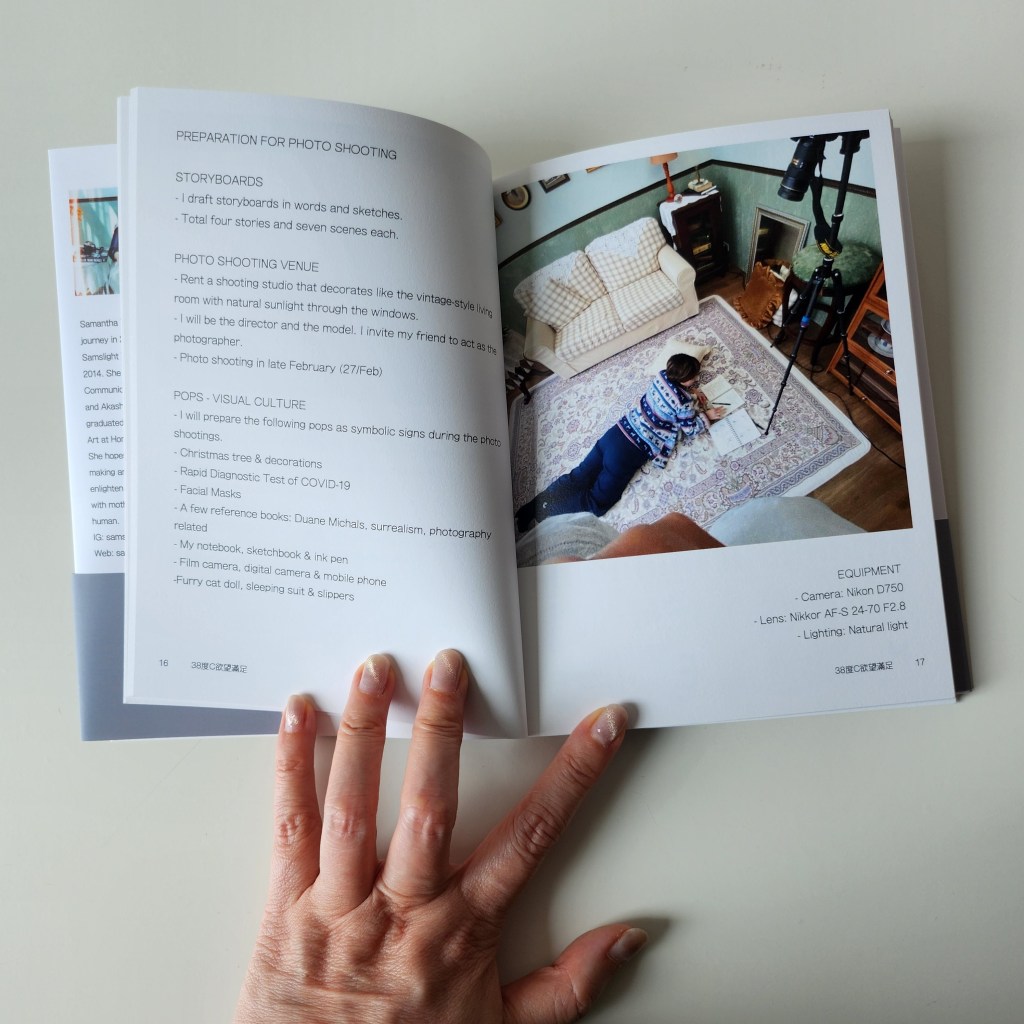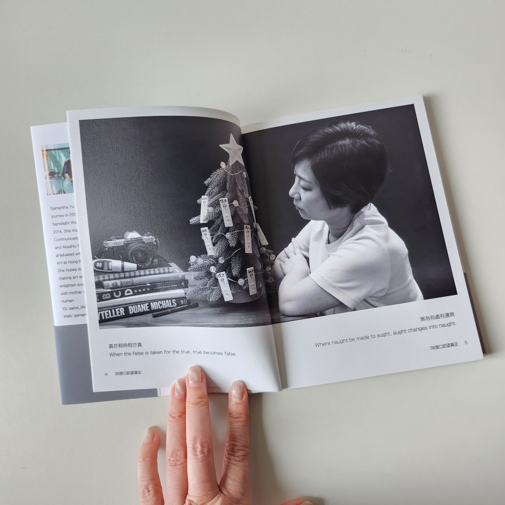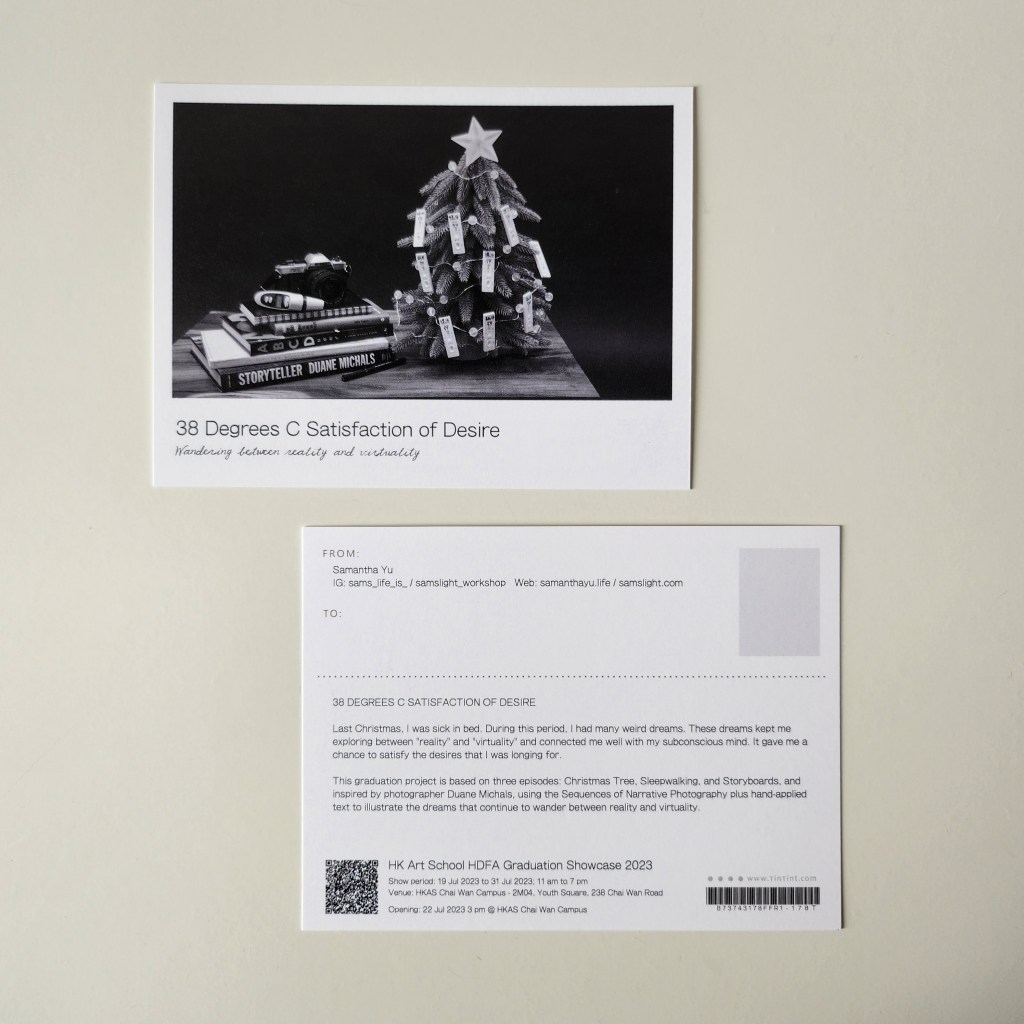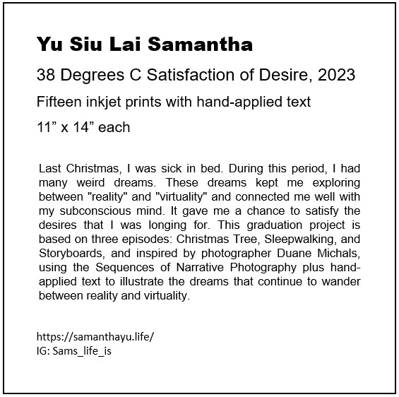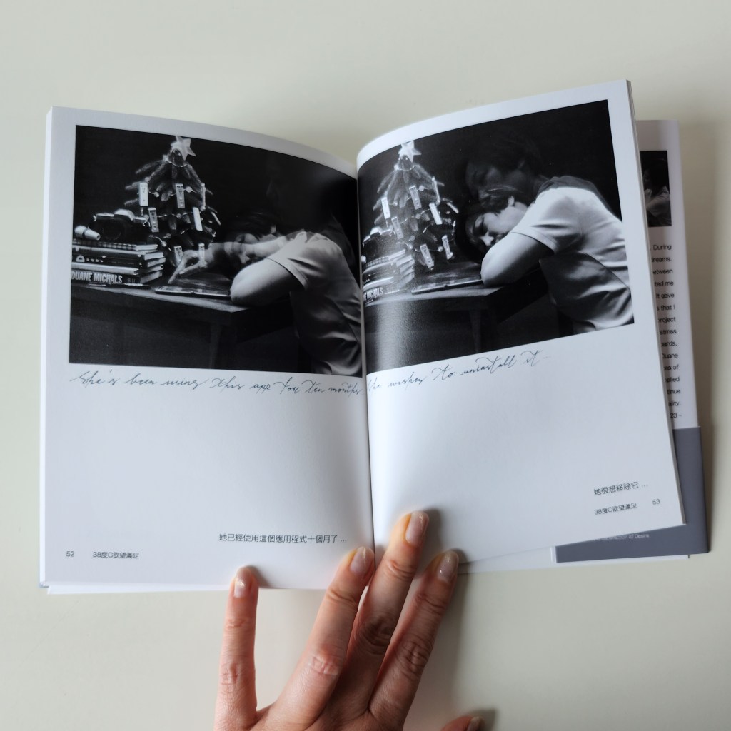 【38度C欲望滿足】去年聖誕節,我臥病在床,期間有很多奇異的夢境,這些夢讓我不斷在「真實」和「虛擬」之間探索,亦使我和潛意識好好連結,把我一直渴望的事,疑幻似真地滿足了。這個畢業作品,以三個單元為主軸:聖誕樹、夢遊和劇本,啟發自攝影大師杜安·麥可斯 (Duane Michals),利用「排列敘事」攝影手法,加上手寫文字,將夢境呈現眼前,繼續在虛實之間徘徊。