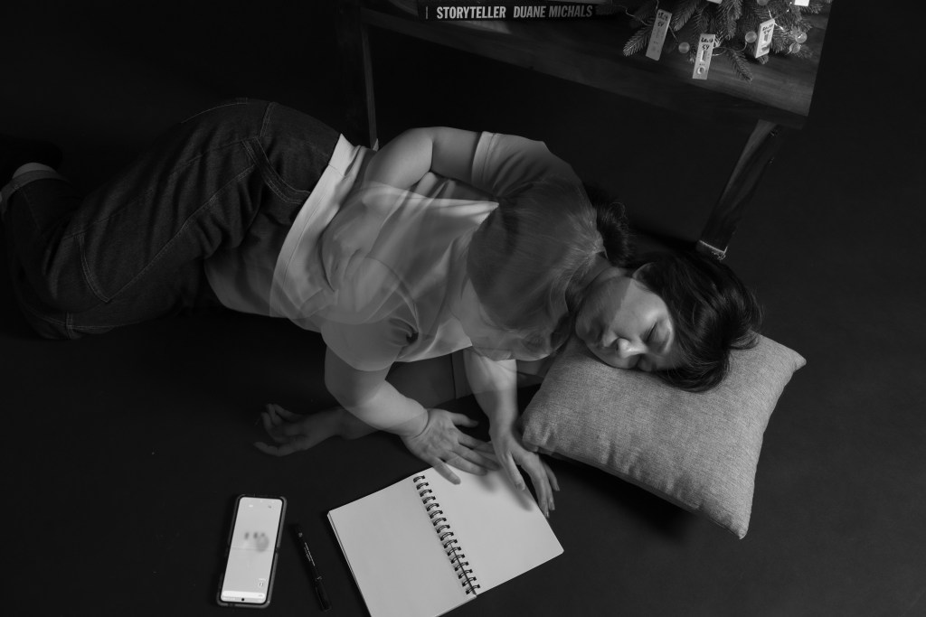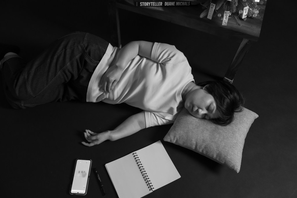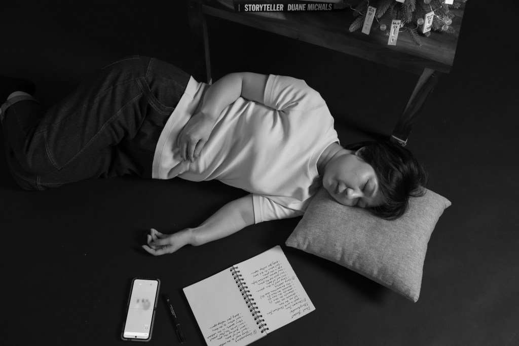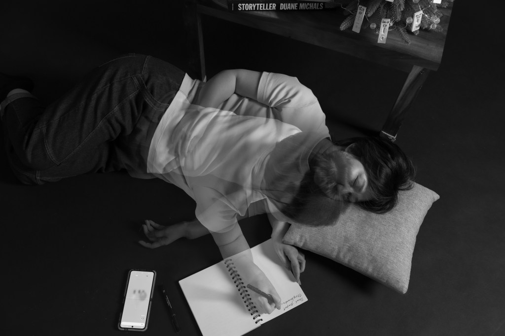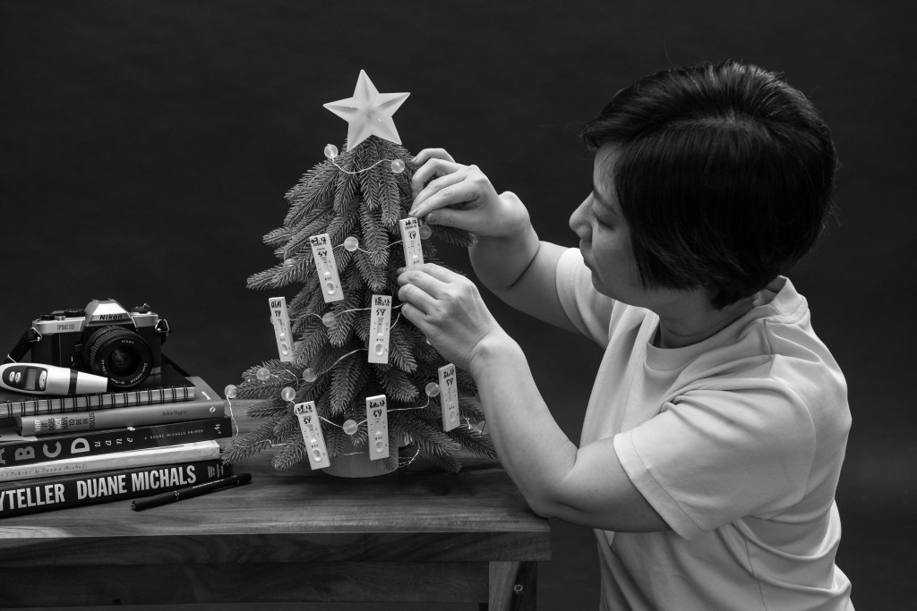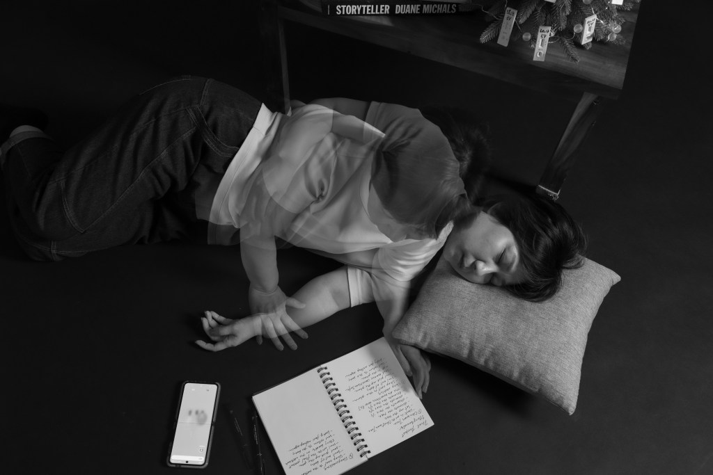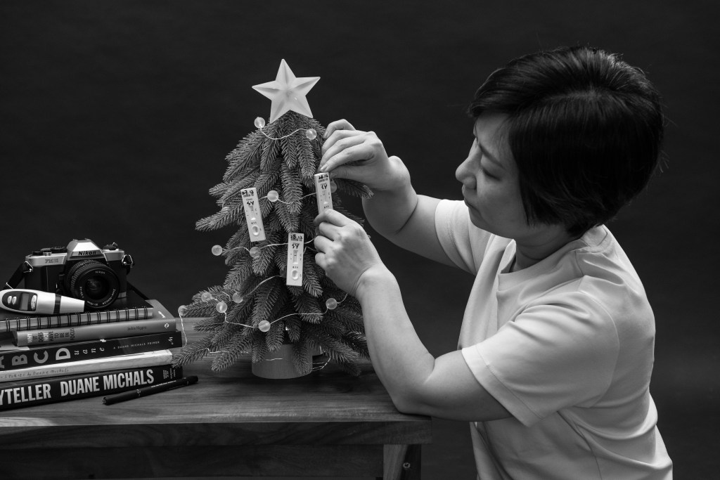 【38度C欲望滿足】去年聖誕節,我臥病在床,期間有很多奇異的夢境,這些夢讓我不斷在「真實」和「虛擬」之間探索,亦使我和潛意識好好連結,把我一直渴望的事,疑幻似真地滿足了。這個畢業作品,以三個單元為主軸:聖誕樹、夢遊和劇本,啟發自攝影大師杜安·麥可斯 (Duane Michals),利用「排列敘事」攝影手法,加上手寫文字,將夢境呈現眼前,繼續在虛實之間徘徊。