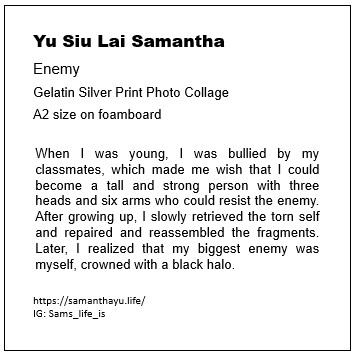 【敵人】年少時受同學欺凌,令我自小希望自己能成為一個三頭六臂、高大強壯的人,能抵禦敵人。長大之後,慢慢把撕裂的自己重拾,將碎片修復、重組,後來才發現,最大的敵人,就是冠上黑色光環的自己。