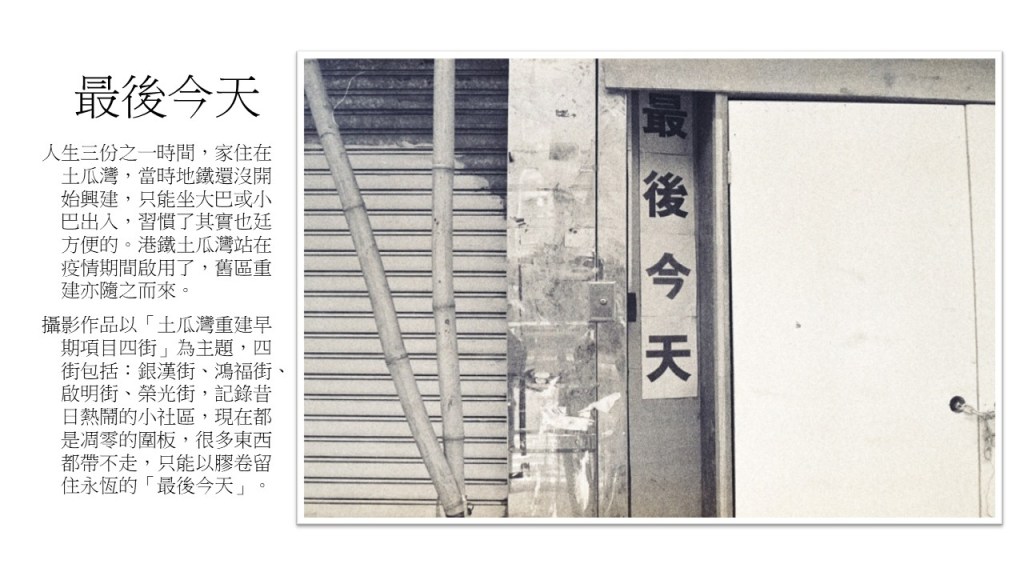 攝影作品以「土瓜灣重建早期項目四街」為主題,四街包括:銀漢街、鴻福街、啟明街、榮光街,記錄昔日熱鬧的小社區,現在都是凋零的圍板,很多東西都帶不走,只能以膠卷留住永恆的「最後今天」。