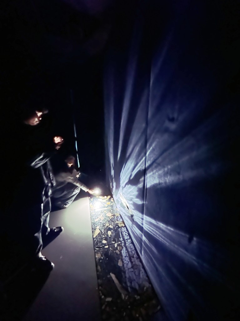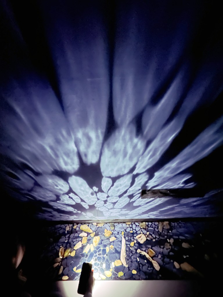 以鏡石散落於暗室地面,讓觀者手持光源涉入,光並非照明,而是移動、折射、破碎、修復、創作,在牆壁和地面之間衍生成細密的波紋,像水痕,也像時間的漣漪。