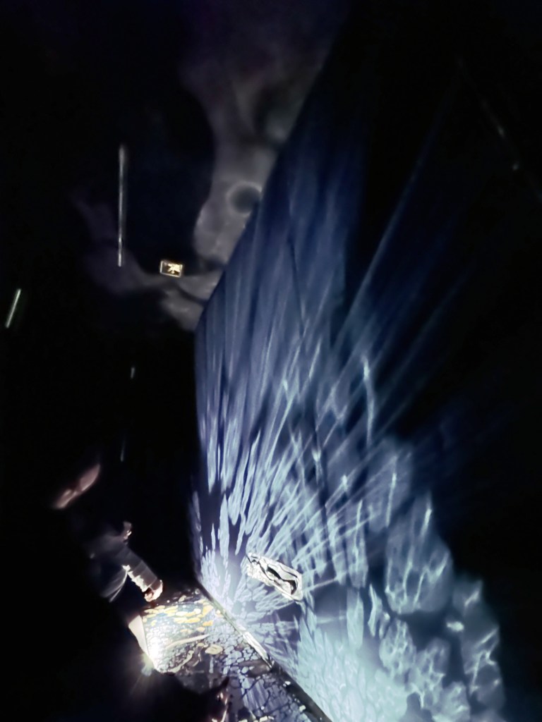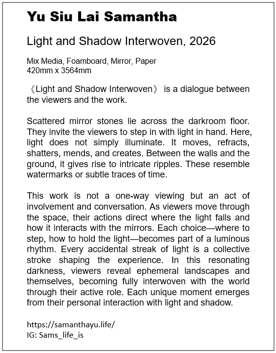 作品並非單向的觀看,而是一種觸碰和對話,觀者的步履、光源的移動和選擇,成為光影旋律的節奏;每一道偶然的光痕,是眾人在空間中畫上美麗的圖畫。那些在黑暗中共振的光,映照出剎那的風景,也映照出觀者自身,在流動的光影間,與世界短暫地交疊,每個瞬間都是獨一無二的,正如我們的存在。